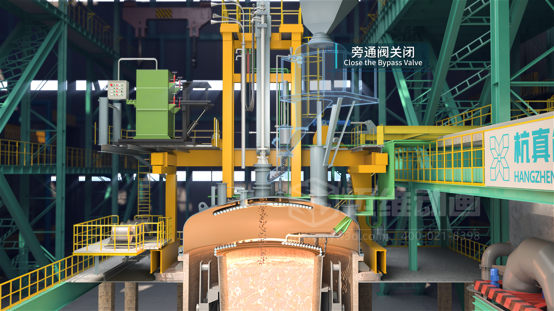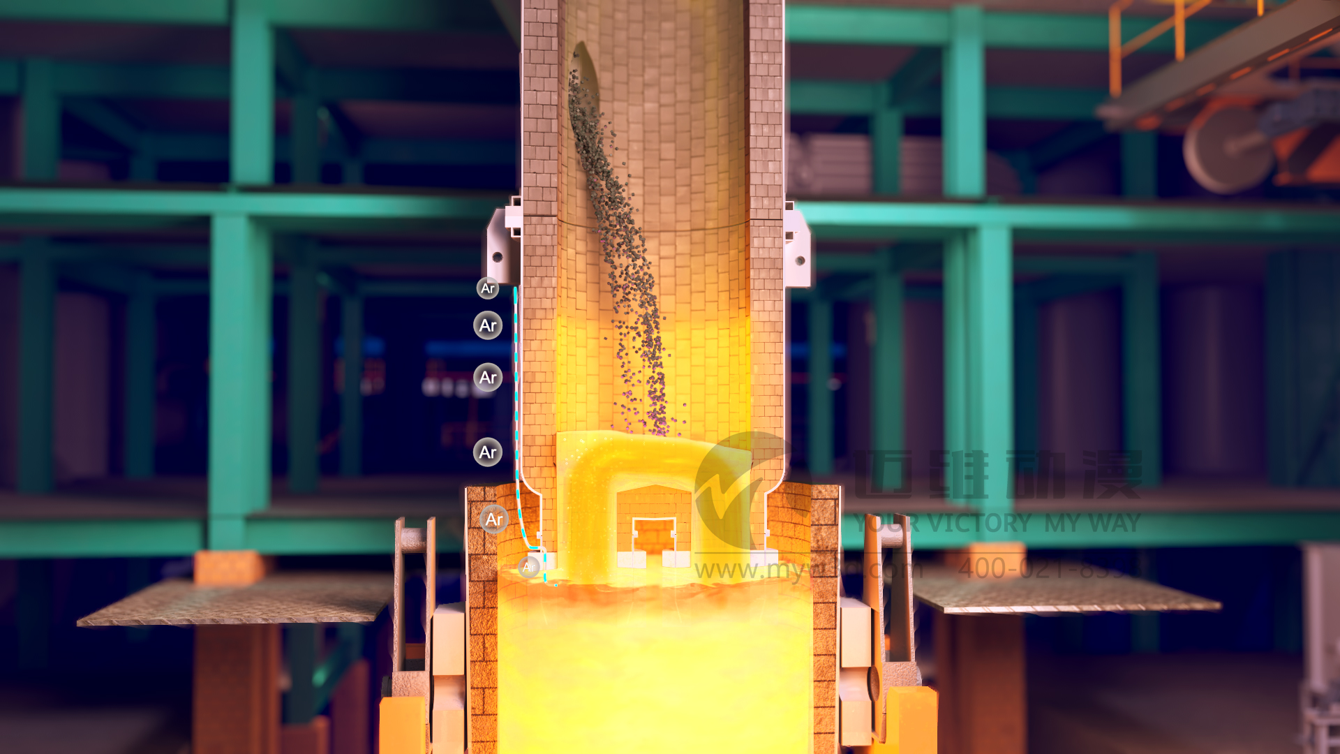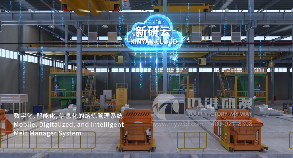 隨著現(xiàn)代工業(yè)和科學(xué)技術(shù)的發(fā)展,各行業(yè)對鋼材質(zhì)量的要求日益提高,需要鋼材具有更高的純凈度、更精準(zhǔn)的化學(xué)成分控制等。傳統(tǒng)的電弧爐冶煉缺陷多,難以滿足相關(guān)行業(yè)對高純凈度鋼的要求,因此催生了如 VOD真空精煉爐等多種精煉工藝來提升鋼水質(zhì)量。VOD真空精煉爐是目前應(yīng)用較廣的一種爐外精煉設(shè)備,在國內(nèi)外鑄鋼生產(chǎn)線中都有較多應(yīng)用,可用于生產(chǎn)不銹鋼鑄件、軸承鋼、合金結(jié)構(gòu)鋼、彈簧鋼、優(yōu)質(zhì)碳素鋼及超低碳不銹鋼等多種鋼種。生產(chǎn)線三維動畫作為一種高效的冶金生產(chǎn)工藝流程宣傳展示工具,可以通過3D技術(shù),模擬還原展示從原料進入到成品鋼產(chǎn)出的整個過程,包括真空脫氣、吹氧脫碳、吹氬攪拌、加料及合金化等各個步驟,同時還能展示設(shè)備的內(nèi)部構(gòu)造、工作原理等以動態(tài)的三維畫面形式呈現(xiàn)出來,讓觀眾可以直觀地看到每個環(huán)節(jié)的運作,遠(yuǎn)比傳統(tǒng)的文字、圖片或靜態(tài)圖表更生動、形象,便于理解,深受冶金行業(yè)企業(yè)用戶的青睞。