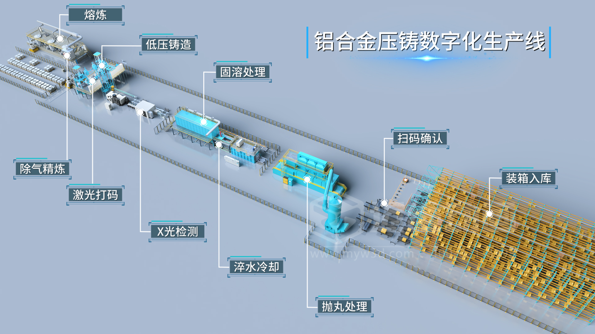 • 鋁合金壓鑄工藝作為一種重要的金屬制品生產(chǎn)制造工藝,對高精密度的零件和產(chǎn)品的生產(chǎn)尤為適用。隨著科技的進步和制造業(yè)的發(fā)展,鋁合金壓鑄件在汽車、摩托車、內(nèi)燃機、電子、儀器儀表、航空航天等領(lǐng)域的應(yīng)用越來越廣泛。這些領(lǐng)域?qū)Ξa(chǎn)品的精度、質(zhì)量和生產(chǎn)效率要求非常嚴格,因此鋁合金壓鑄工藝的優(yōu)化和創(chuàng)新顯得尤為重要。三維動畫作為鋁合金壓鑄生產(chǎn)線的宣傳媒介,通過生產(chǎn)線三維動畫制作可以展示鋁合金壓鑄工藝的各個環(huán)節(jié),使客戶對鋁合金壓鑄產(chǎn)品的制造過程有更深入的了解,從而提高產(chǎn)品的信任度和滿意度。鋁合金壓鑄數(shù)字化生產(chǎn)線三維動畫作為企業(yè)展示技術(shù)實力和產(chǎn)品優(yōu)勢的得力宣傳展示工具,能夠增強企業(yè)在市場上的競爭力,吸引更多潛在客戶和合作伙伴。?